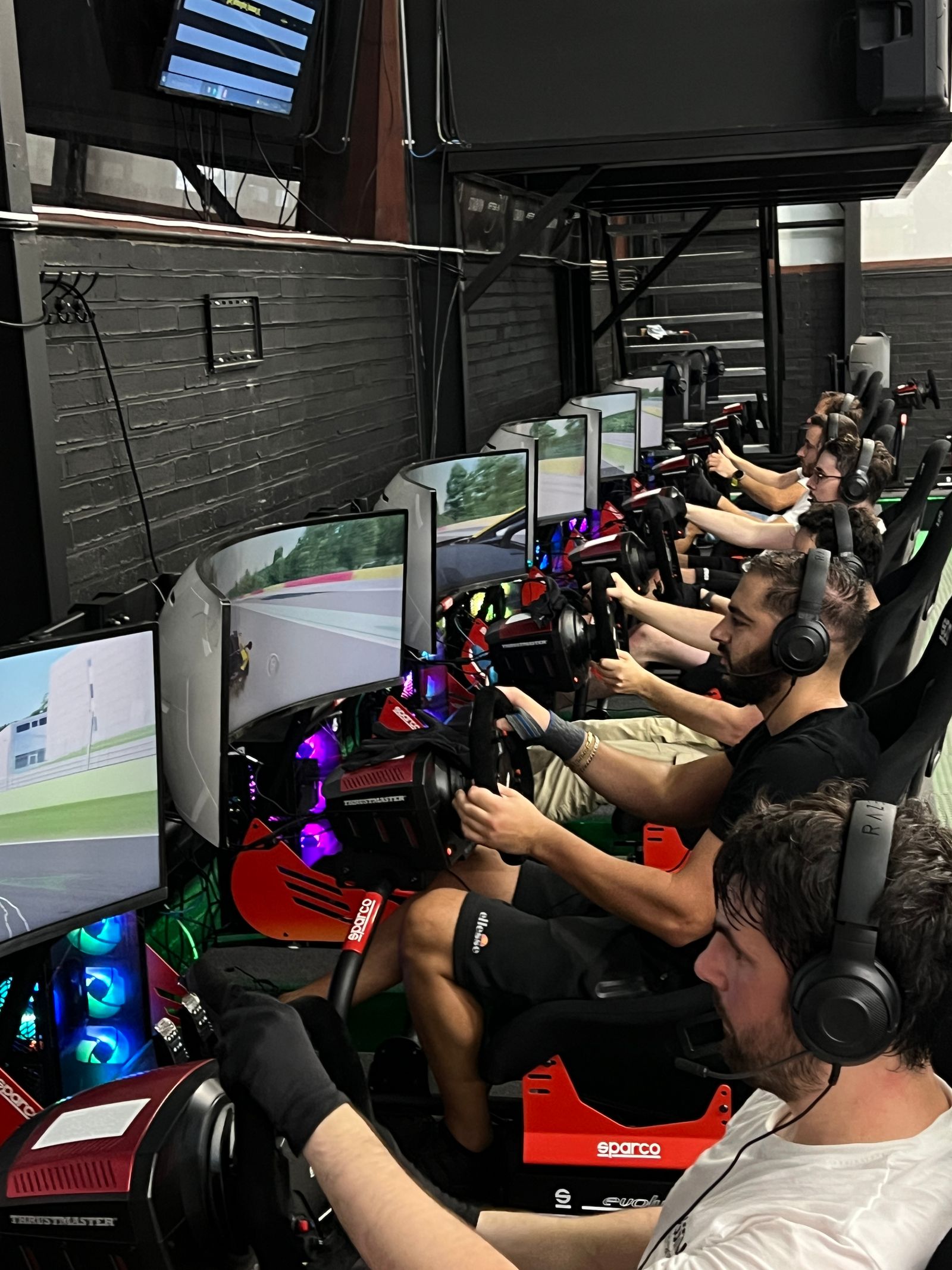 Dit is het meest directe scenario: een race simulator toernooi met 10 personen waarbij iedereen gelijktijdig rijdt. Je bouwt spanning op door niet één lange race te rijden, maar meerdere korte races met punten.
